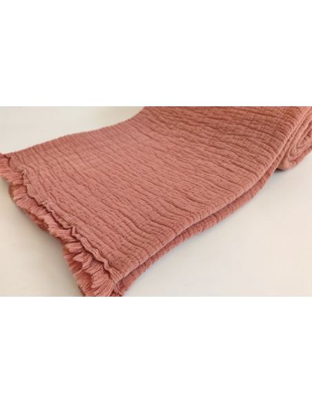 Cotton blanket, with fringes at the ends and stonewash finish. This finish, combined with its composition, provides a natural and definitive shrinkage, as well as a very pleasant, smooth and soft touch. Thus, it allows it to be washed frequently, without shrinking and without the need to iron.