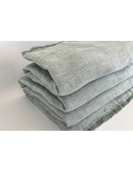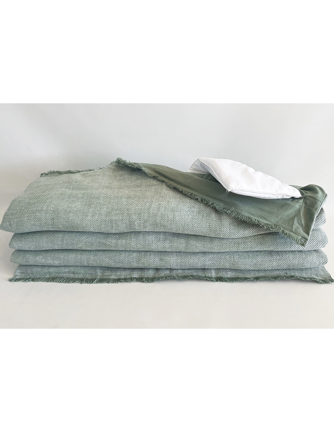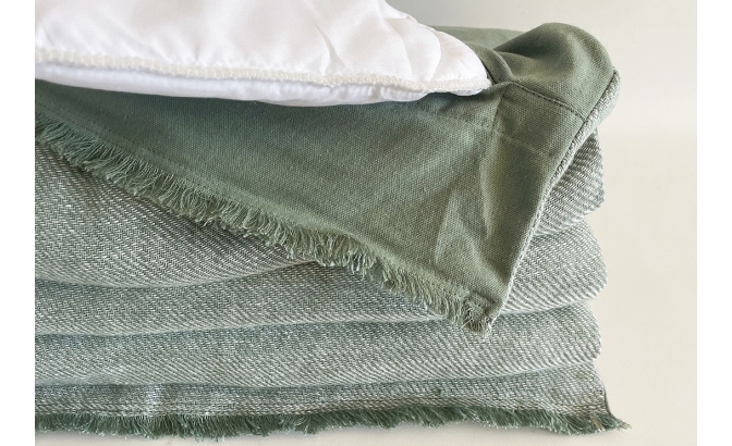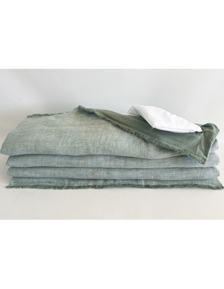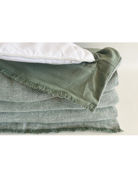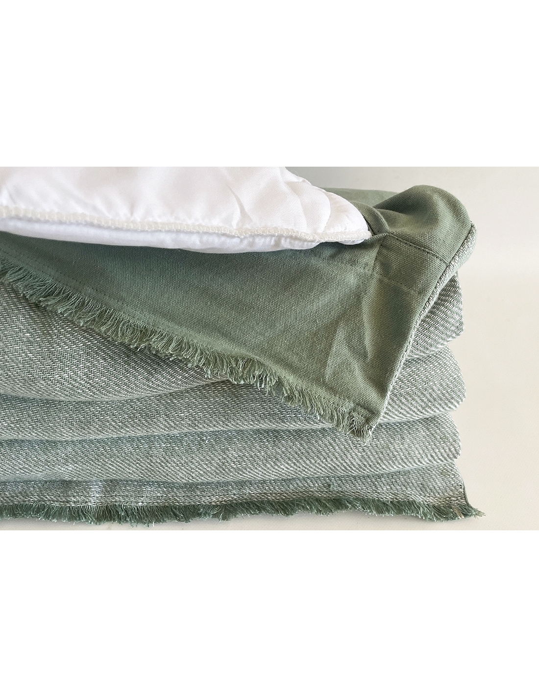 Plaid with two sides, one side in linen and the other in cotton. It has fringes on both ends and a zipper on the wrong side to insert or remove the filling.