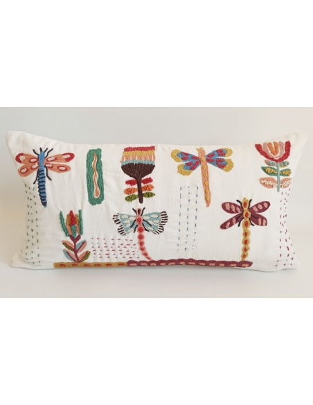 Cotton cushion cover featuring various handcrafted embroidery techniques and natural motifs. Plain back. Bottom zipper.