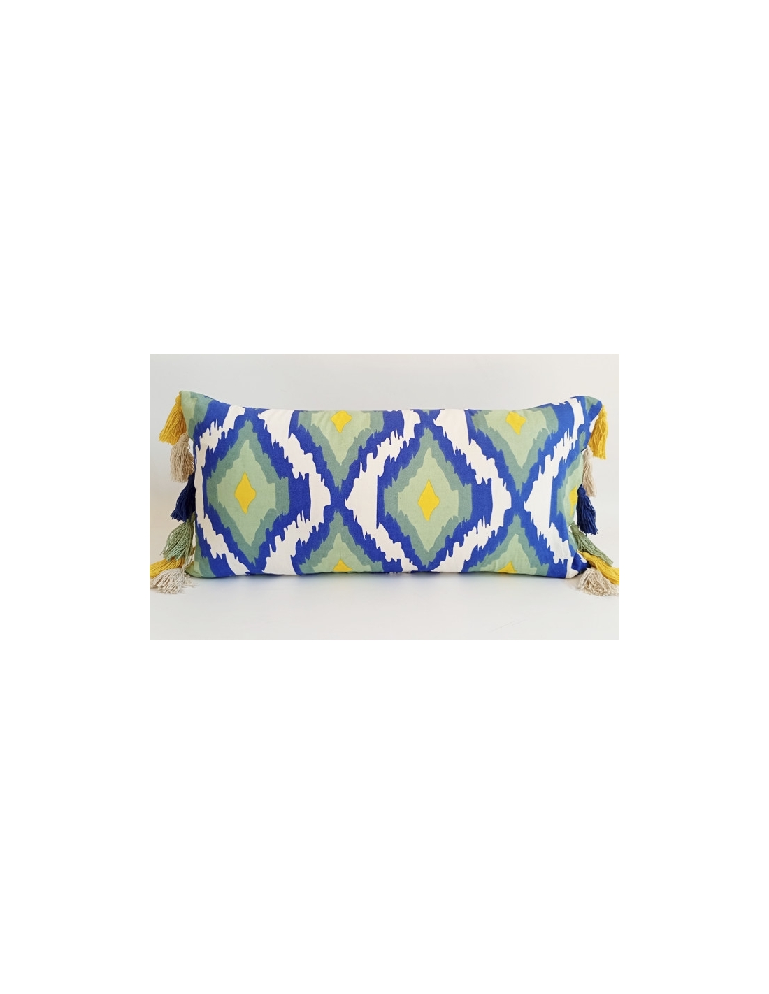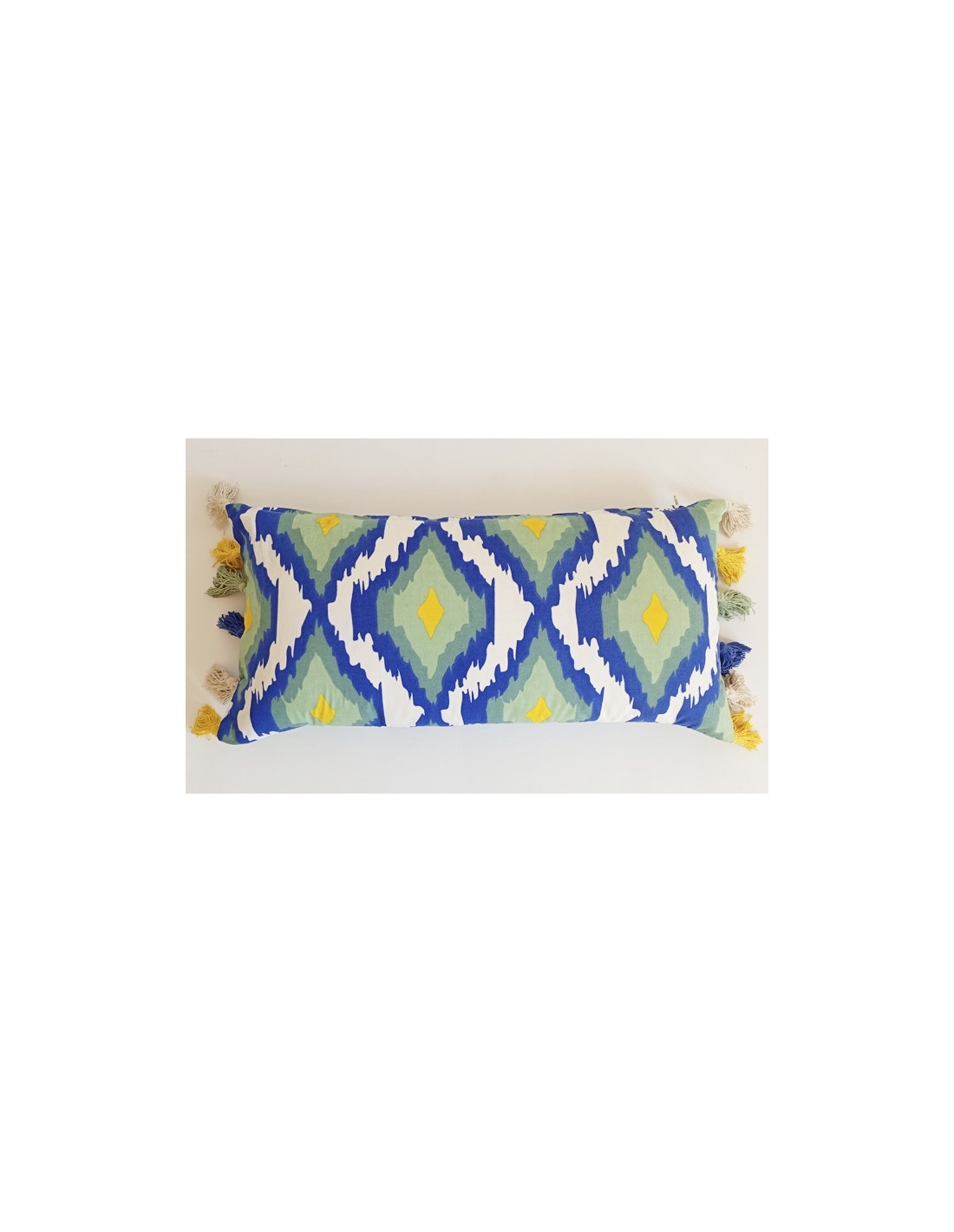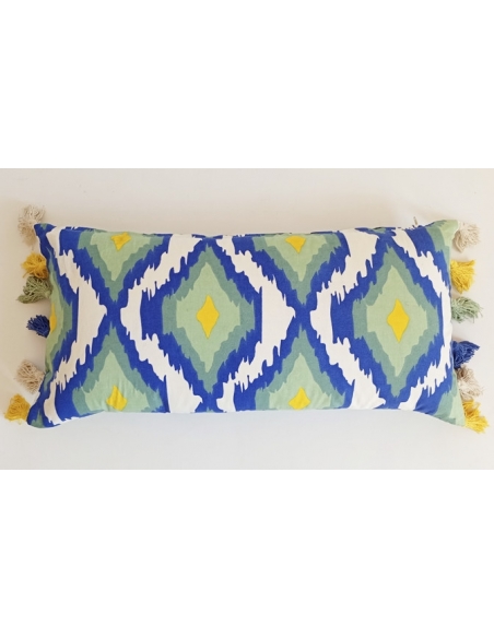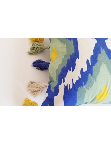 Cotton cushion cover with digital print. The back is identical to the front. Bottom zipper. Colorful pom-pom details on the sides.