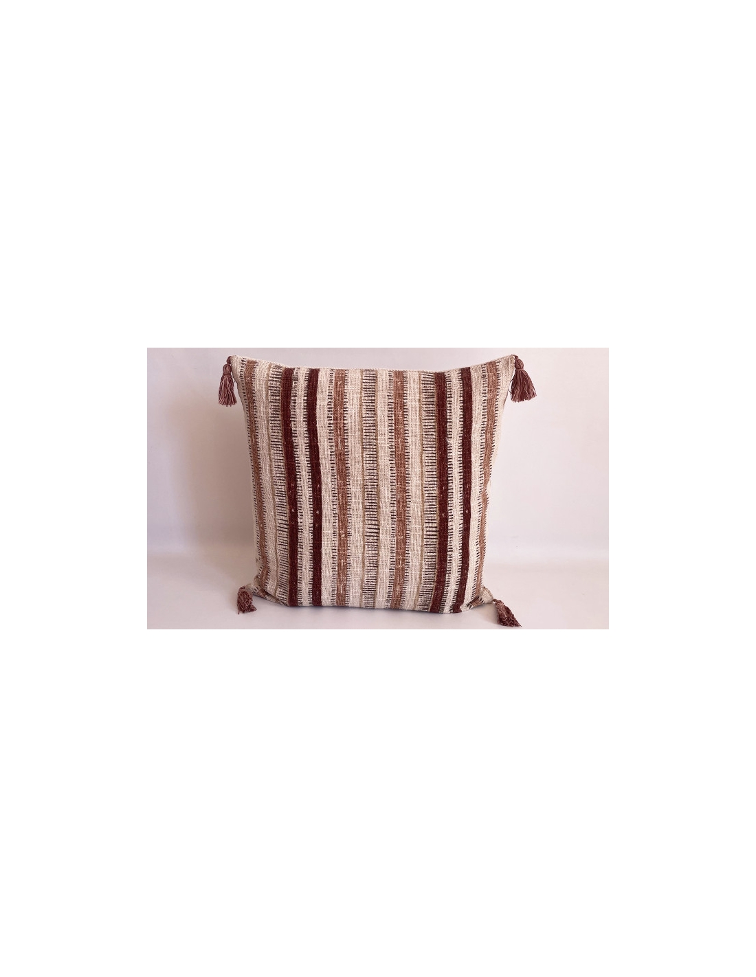 Rectangular slub cotton cushion cover with an earth-toned stripe print. The back is identical to the front. It closes with a hidden zipper at the bottom. Each cushion may have slight color variations due to the dyeing process and screen display