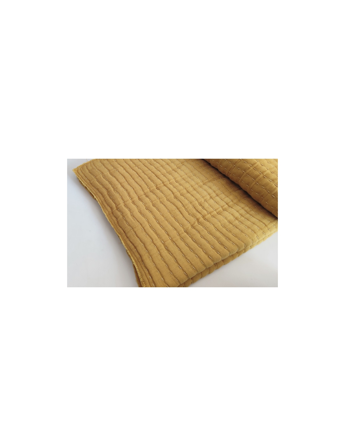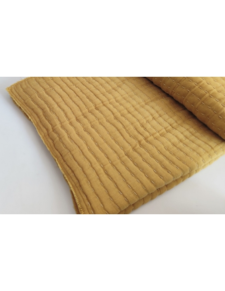 Cotton blanket with frayed edges and Kantha stitching, giving it a soft and rustic quilted effect.