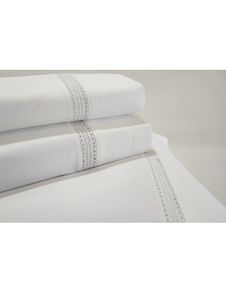 Sheets in 100% combed cotton and mercerized satin 1000 threads, with an embroidered strip applied over an 11cm flap that gives it lightness and elegance, without losing simplicity.