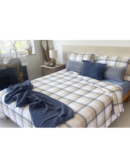 100% cotton duvet bag with design and 200 thread count percale backing, as well as pillows in different sizes.