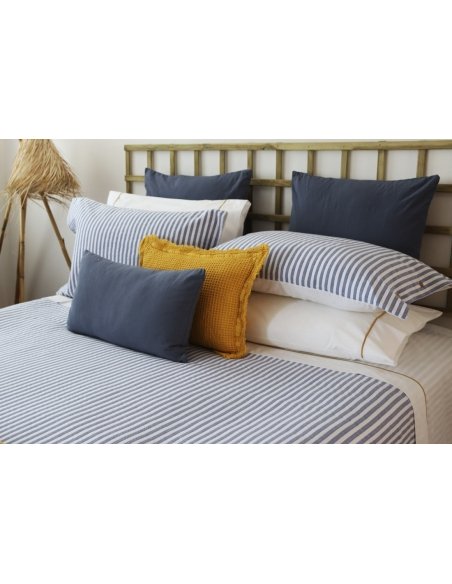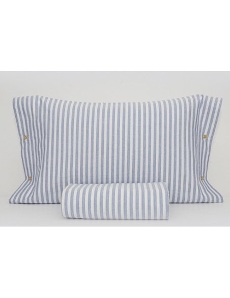 Saco de edredão com desenho de riscas e avesso liso branco, assim como as respetivas almofadas. Permite dormir com o lado liso e decorar com o lado estampado.
