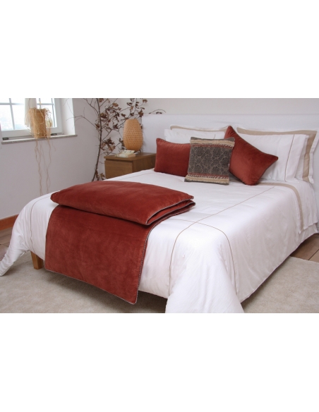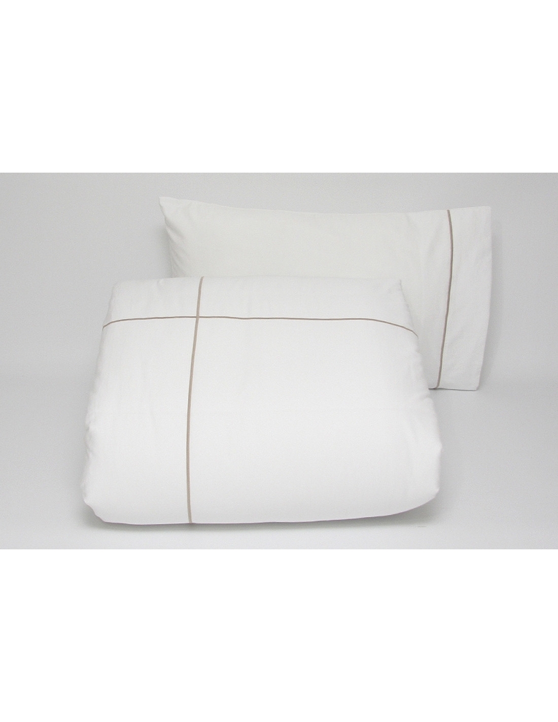 Saco de edredão e almofadas lisas com bordado de cordões de cor. As almofadas têm aplicação do bordado num lado e fecham com uma aba.