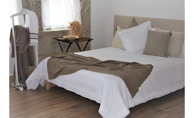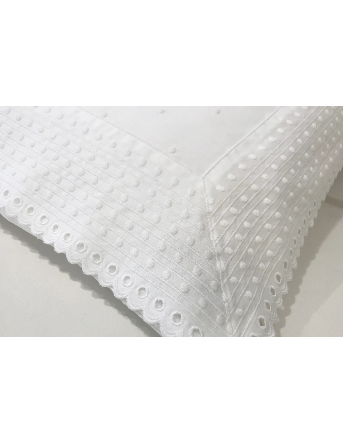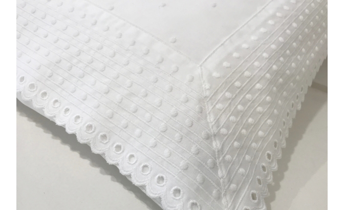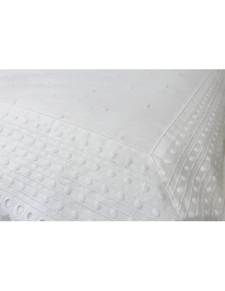 Saco de edredão bordado e com aplicação de bordado a toda a volta. As almofadas são lisas com aplicação do bordado nos dois lados e fecham com uma aba.