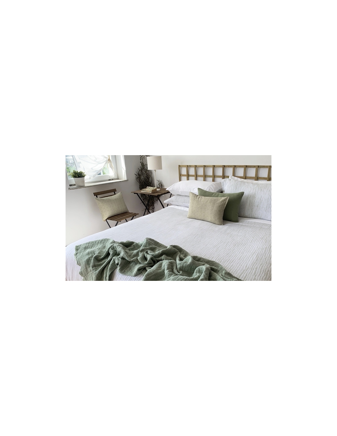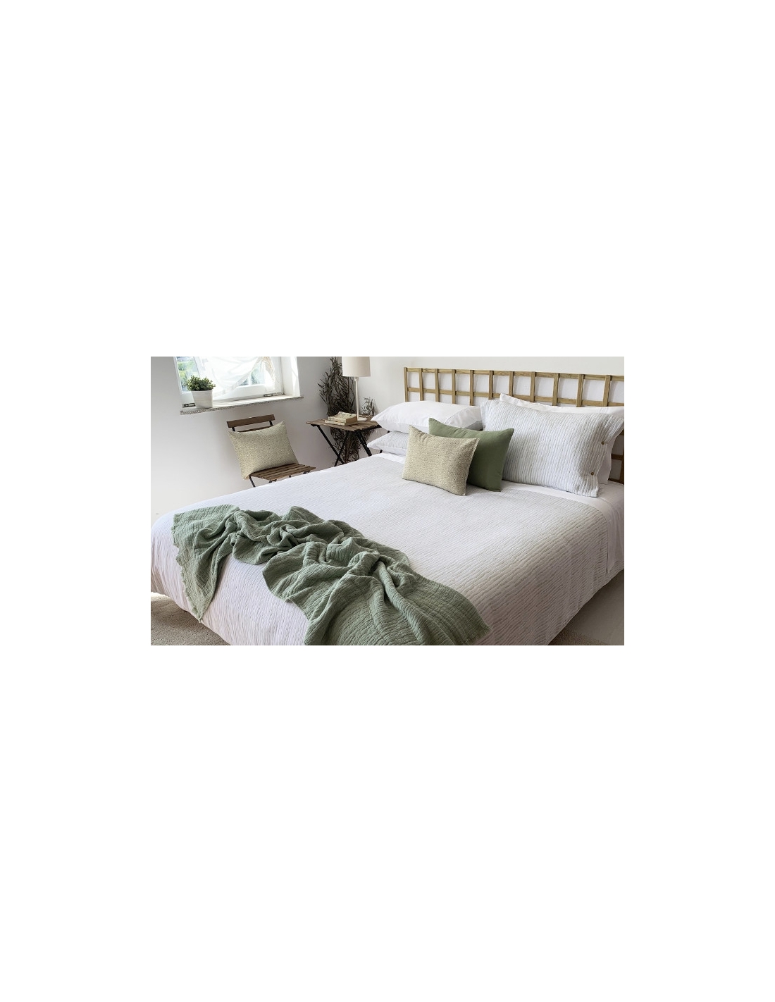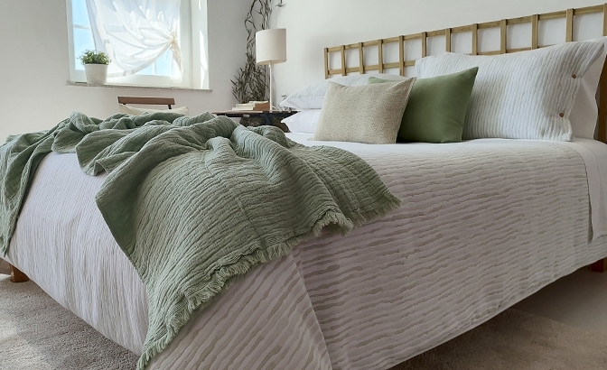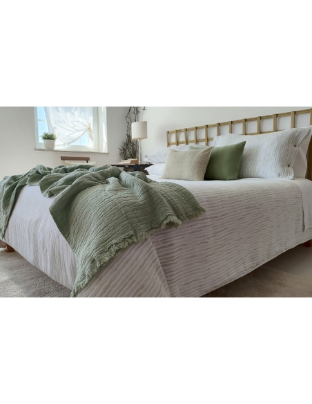 Duvet bag with fabric designed with a soft texture that provides a quilt effect and a smooth white back, as well as the respective pillows. Allows you to sleep on the smooth side and decorate with the textured side. The bag closes with a 0.45 cm flap at the bottom to place under the mattress or make an envelope, preventing it from sliding around. And the cushions close with buttons on both sides. Very pleasant touch and easy to iron.