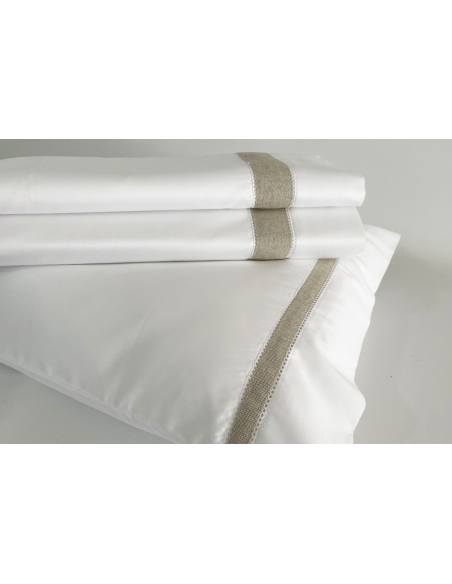Top sheet and pillows with open stitch application with linen fabric. Cushions have application on both sides and close with a flap.