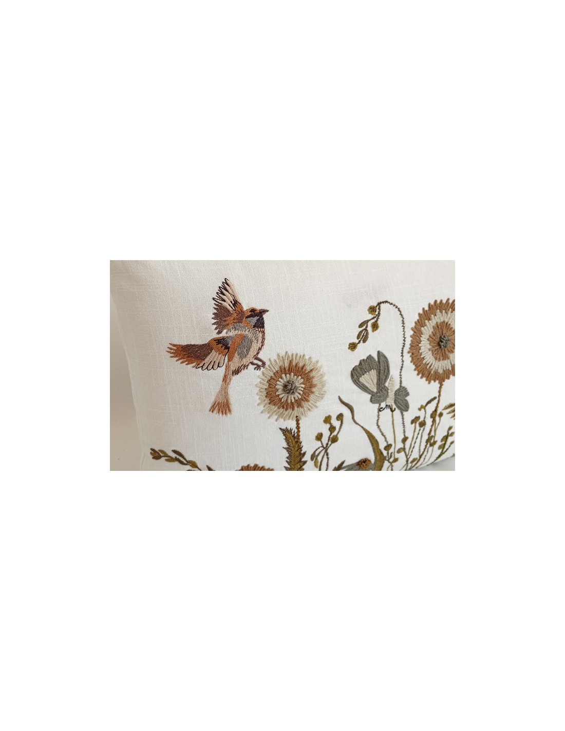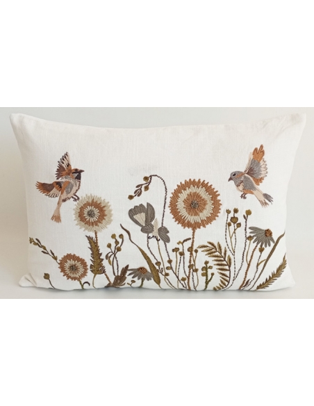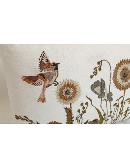 Printed cushion cover with embroidered details in relief.