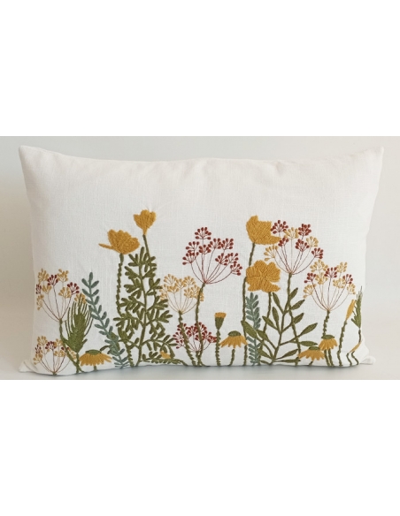 Printed cushion cover with embroidered details in relief.