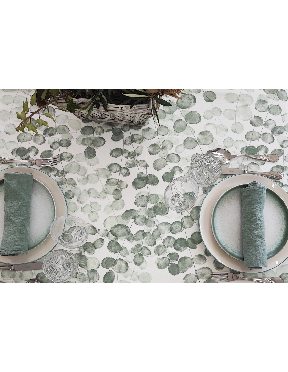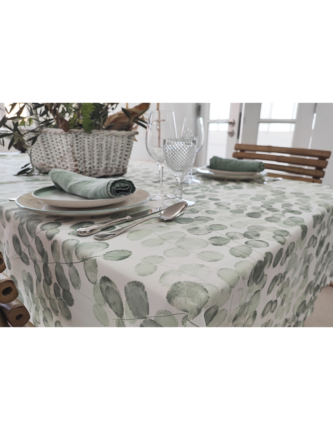 Printed tablecloth with anti-stain and anti-wrinkle treatment.