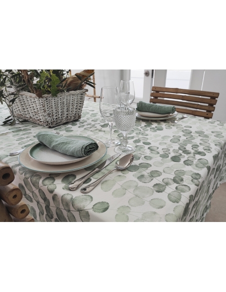 Printed tablecloth with anti-stain and anti-wrinkle treatment.