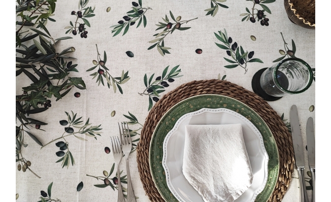 Printed tablecloth with anti-stain and anti-wrinkle treatment.