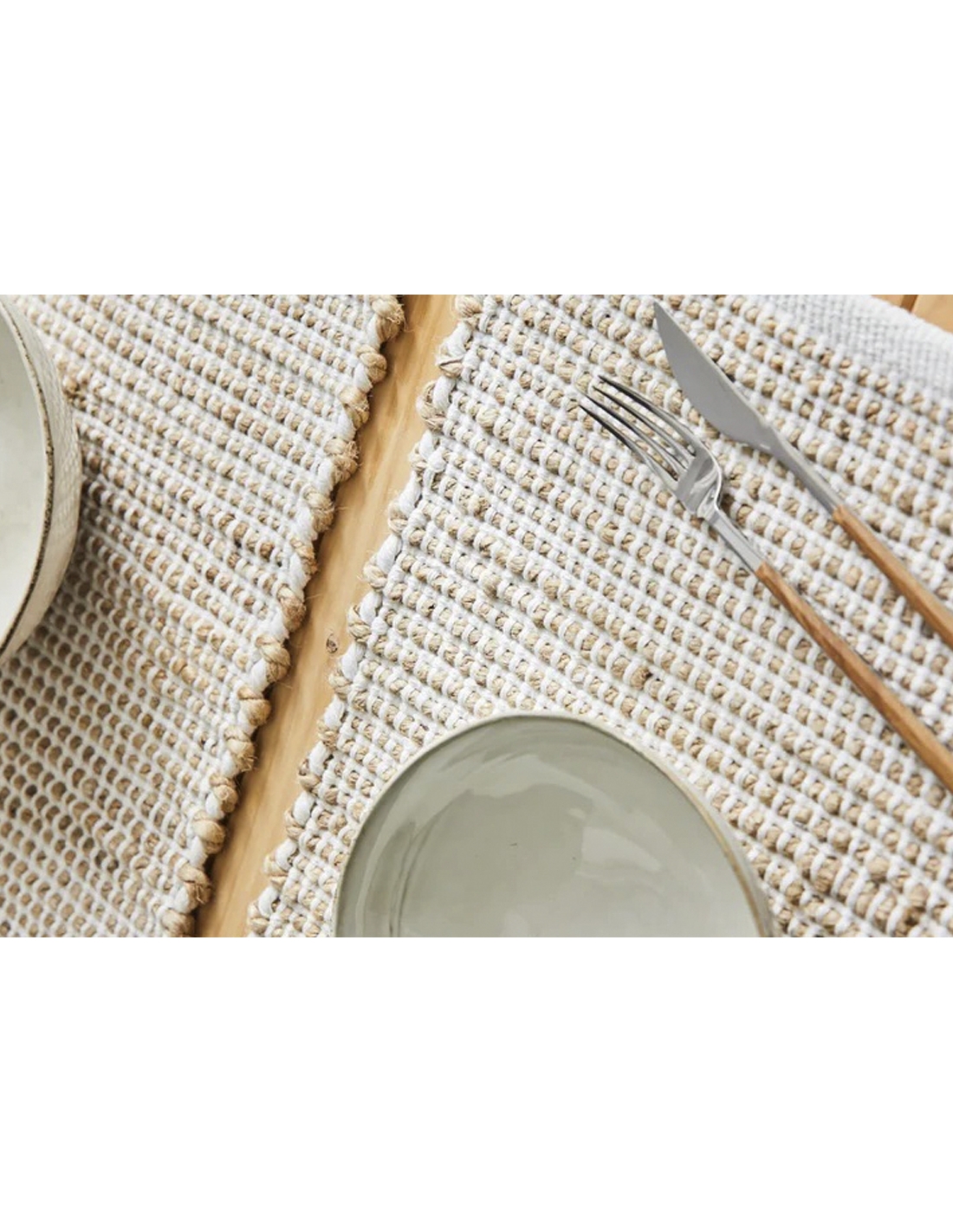Beige jute and cotton placemat. It is the perfect choice to add a touch of class and elegance to any table, whilst also being practical and resistant to daily use.