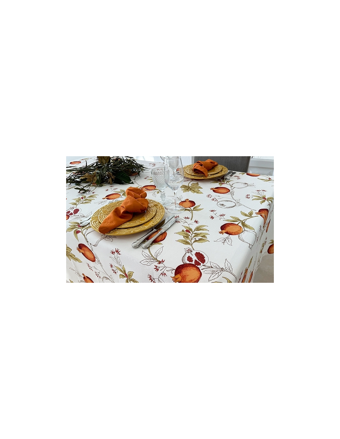 Printed tablecloth with anti-stain and anti-wrinkle treatment.