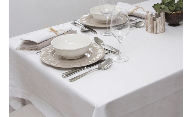 Tablecloth with embroidered polka dots in the center and all around. Finished with a 5cm hem, finished with an open stitch.