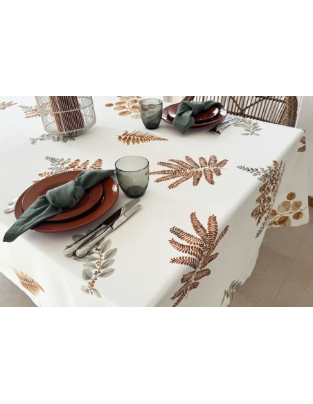 Printed tablecloth with anti-stain and anti-wrinkle treatment.