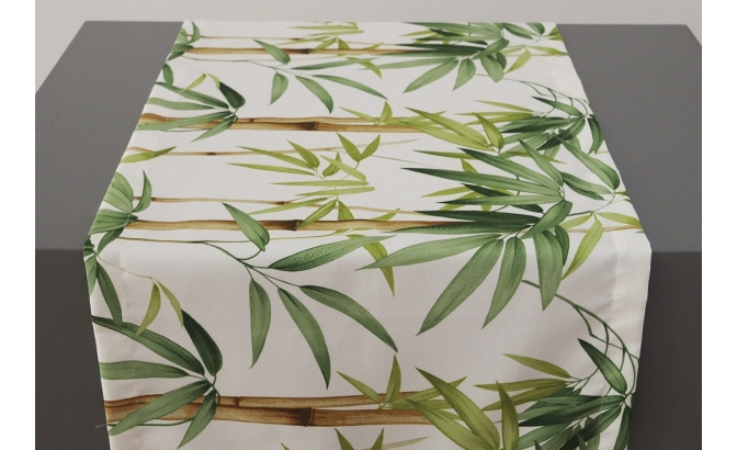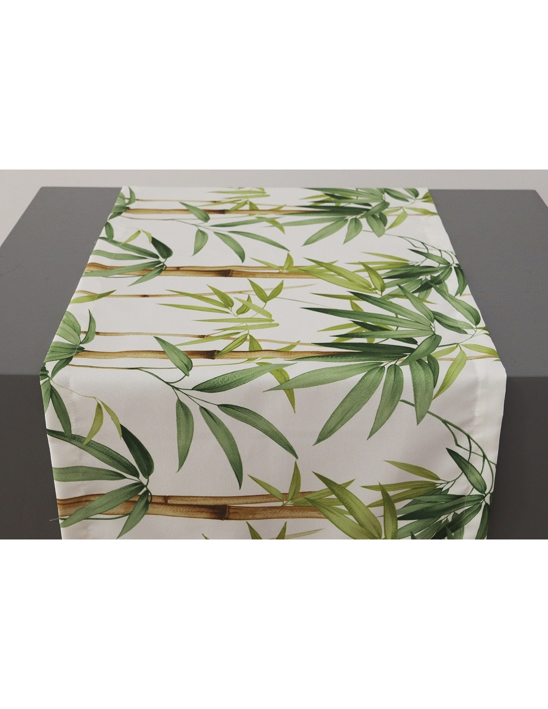 Printed table runner with anti-stain and anti-wrinkle treatment.