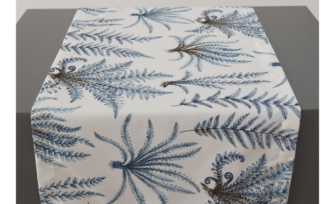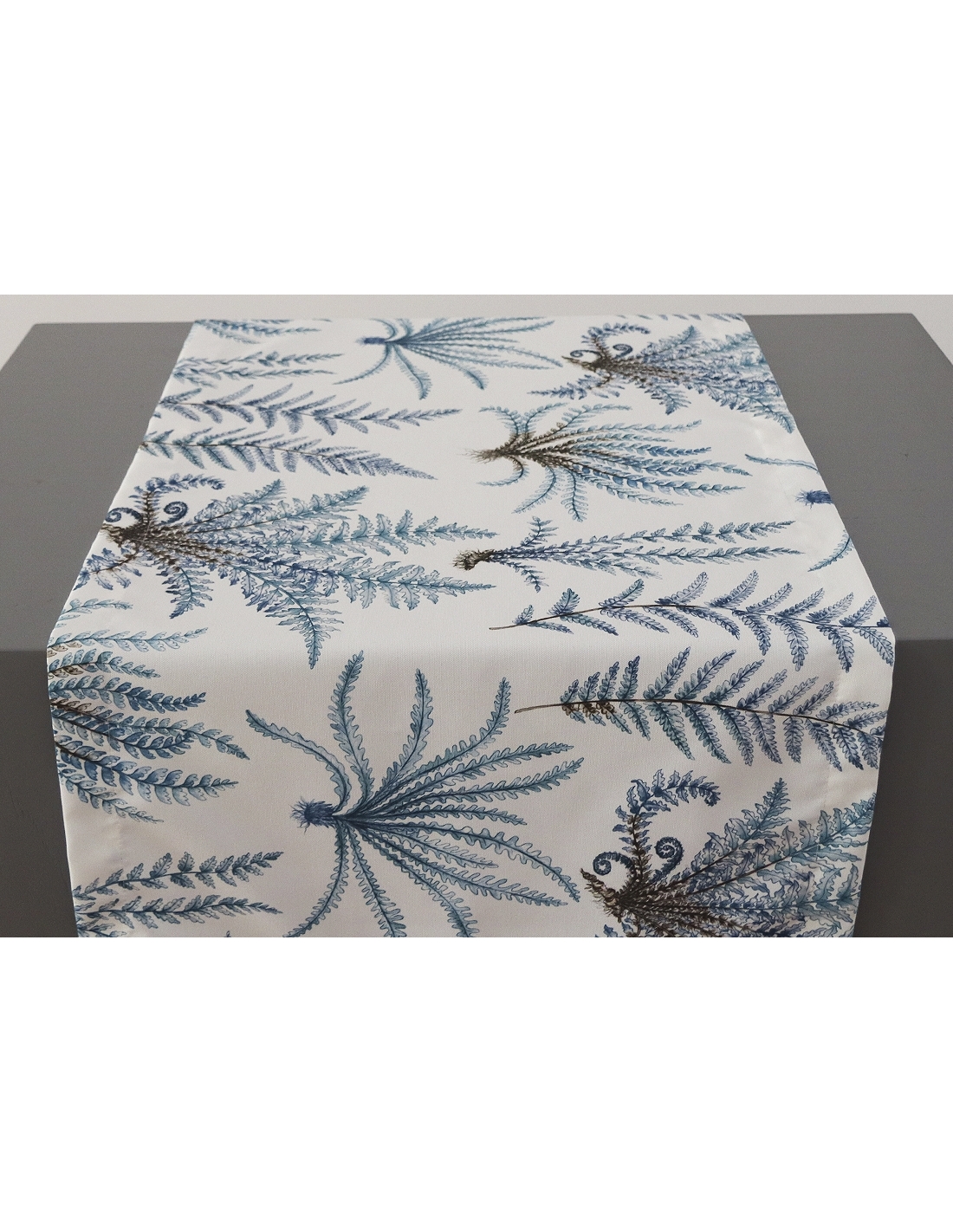Printed table runner with anti-stain and anti-wrinkle treatment.