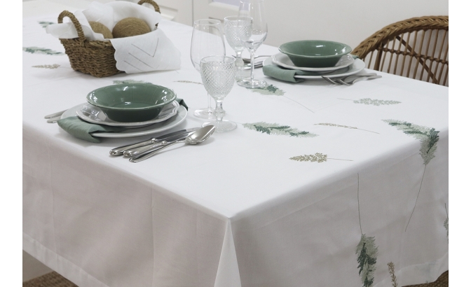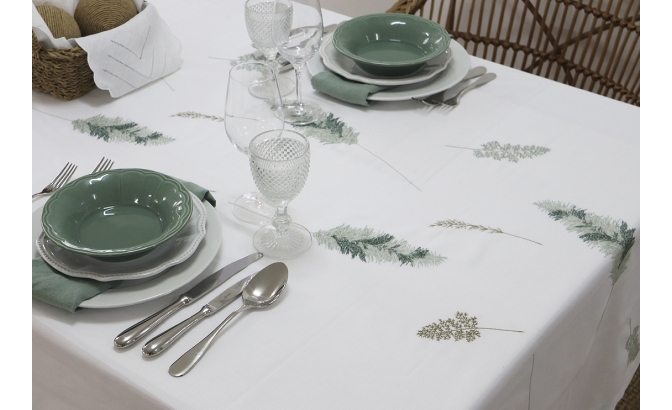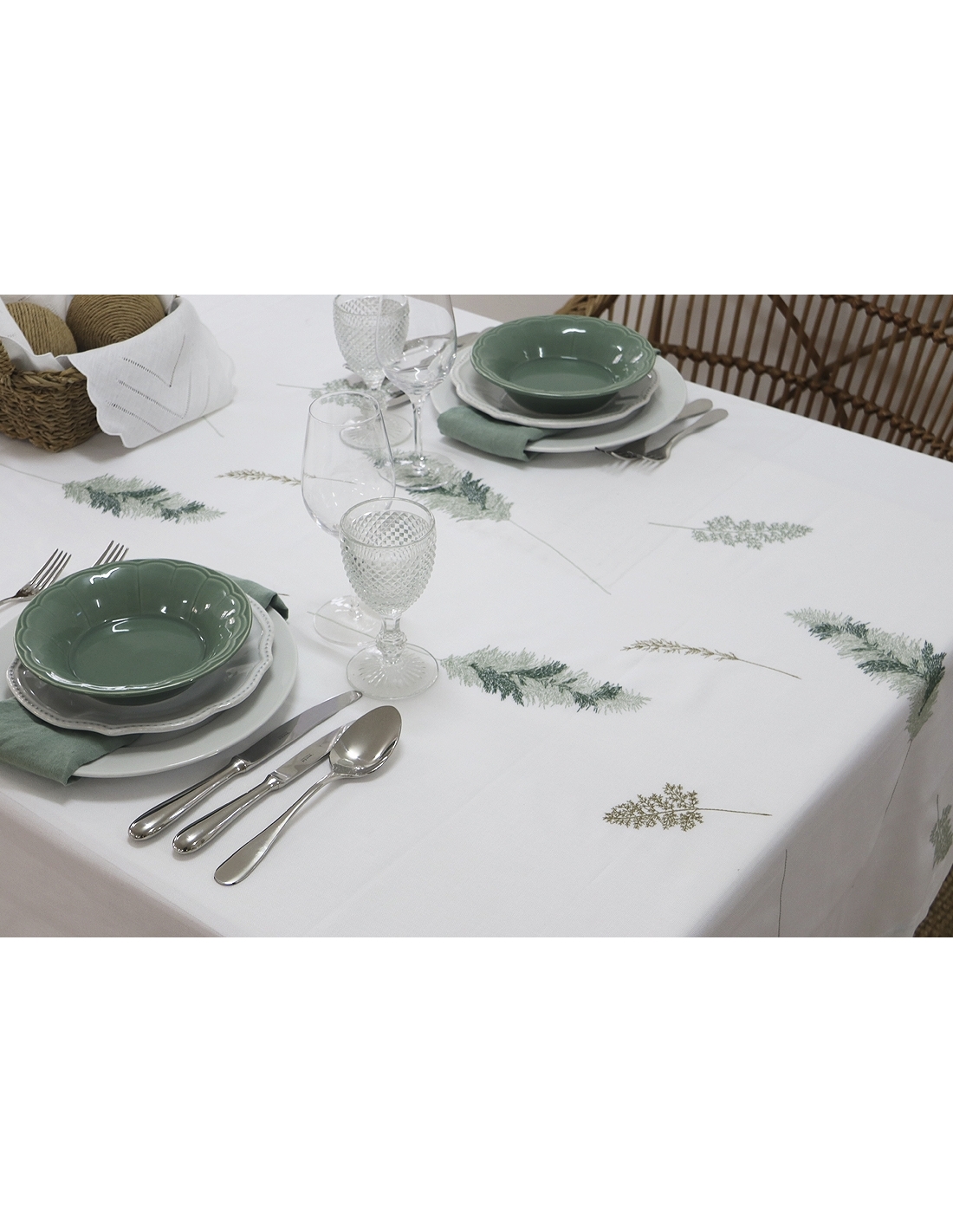 Tablecloth with colored embroidery in the centre, running the entire length, forming a table runner effect.Its composition in cotton and polyester, gives properties of easy maintenance, being easy to wash and iron.