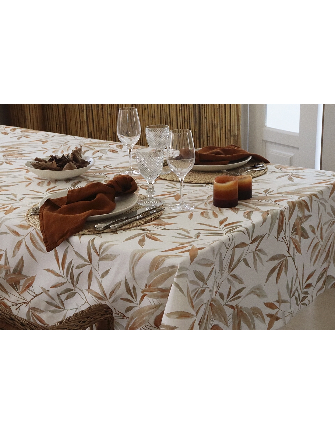 Printed tablecloth with anti-stain and anti-wrinkle treatment.