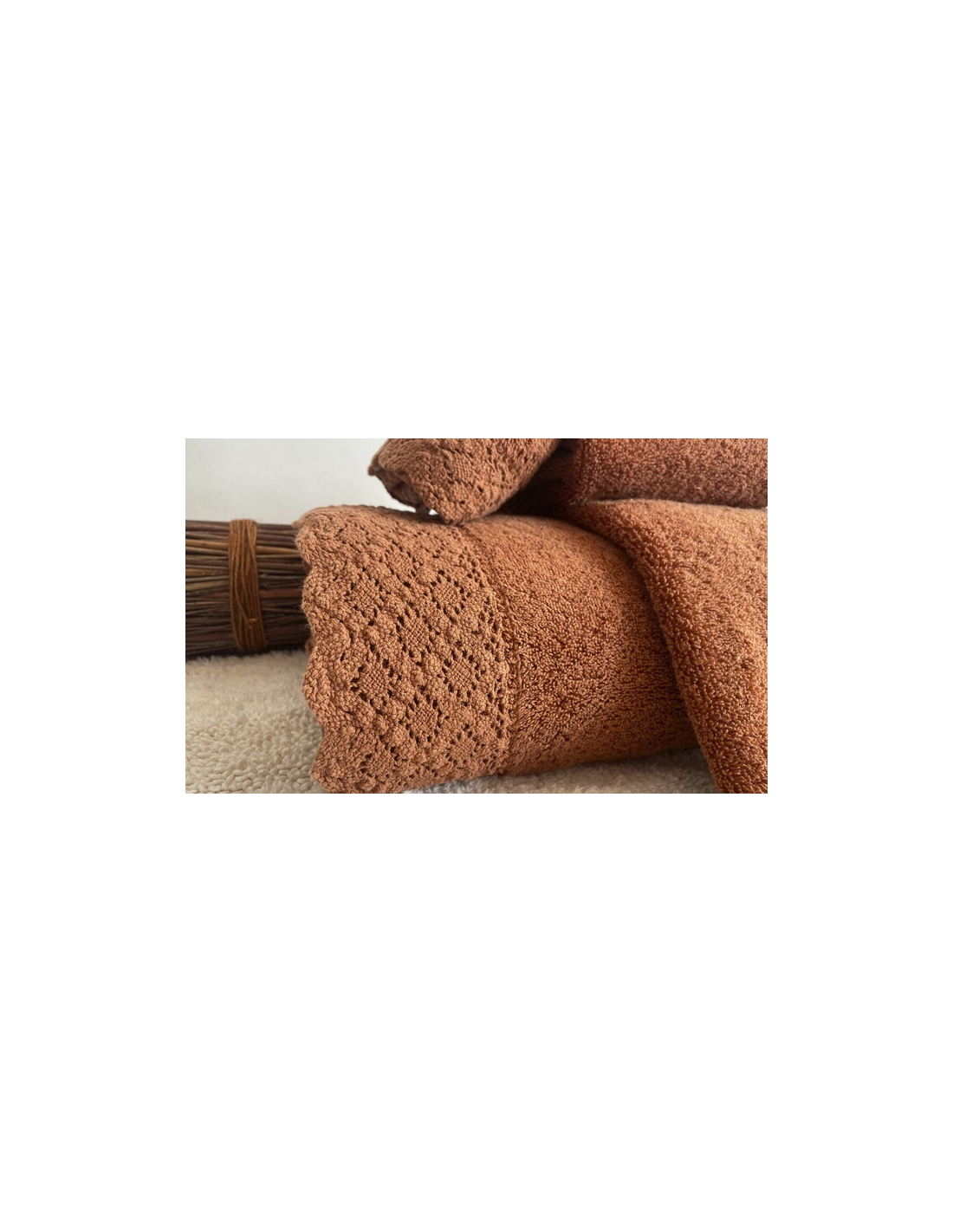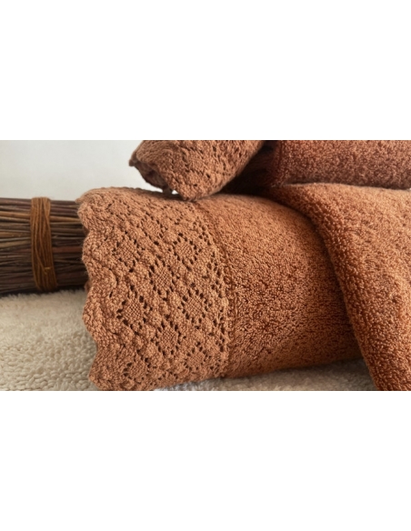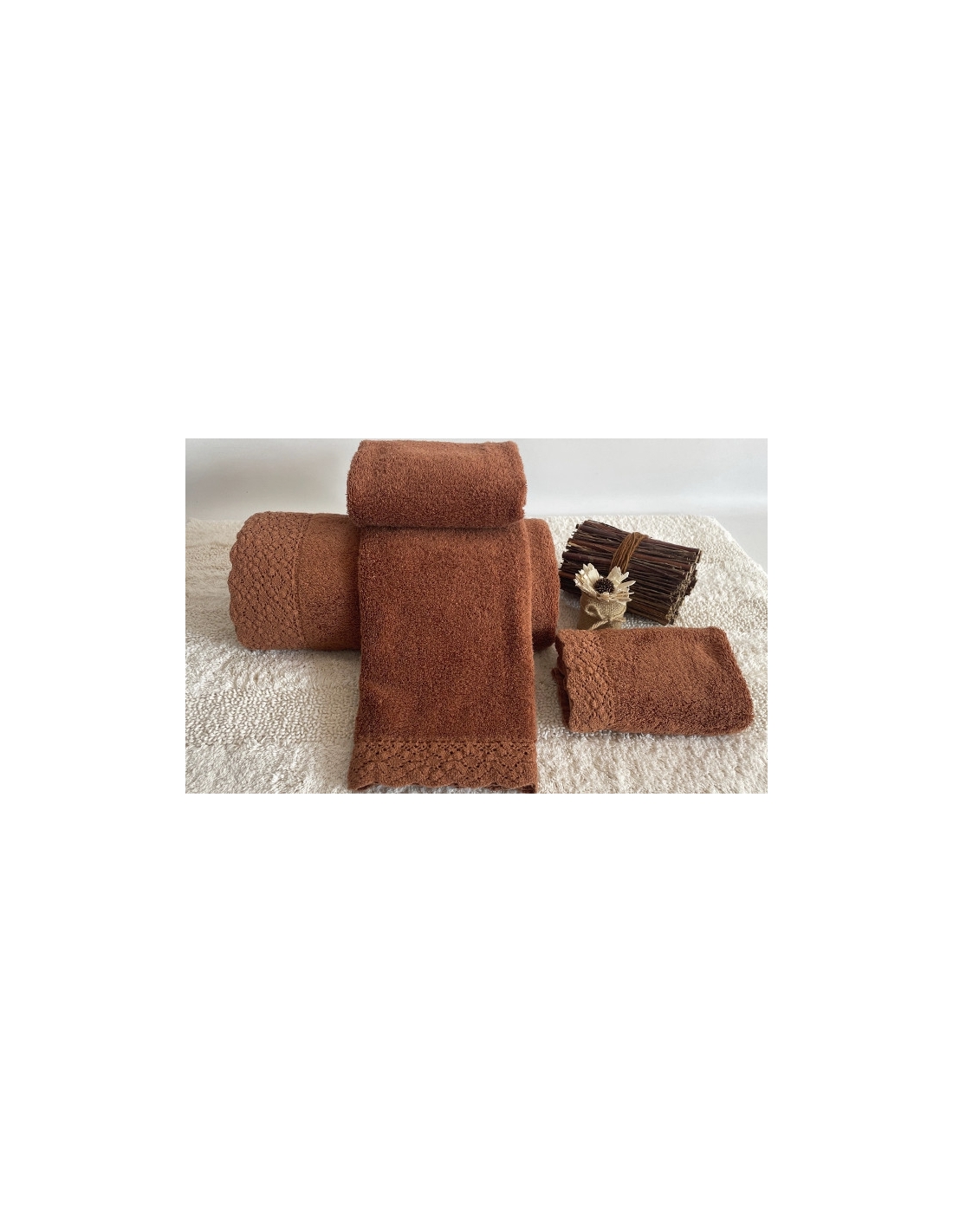 Three piece towel set with lace trim at the edges.