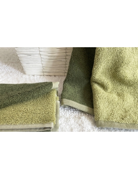 High-quality cotton towel set, reversible with wide stripes in shades of green and beige that add a natural and contemporary touch to the bathroom.