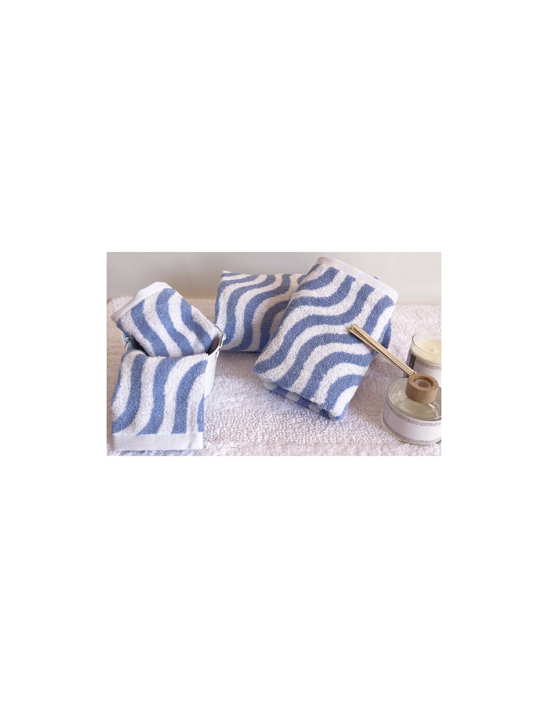 Set of soft and absorbent cotton towels with a flowing wave pattern that adds a fresh and contemporary touch to the bathroom.