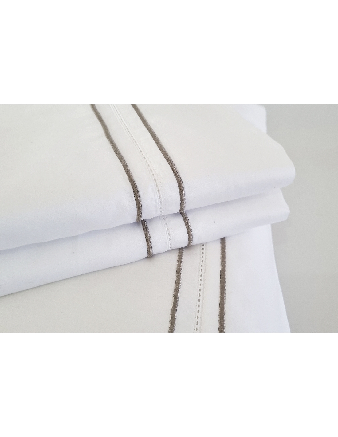 Sábana encimera y almohadas con aplicación de entremedio. Las almohadas se aplican en ambos lados y se cierran con dos solapas.