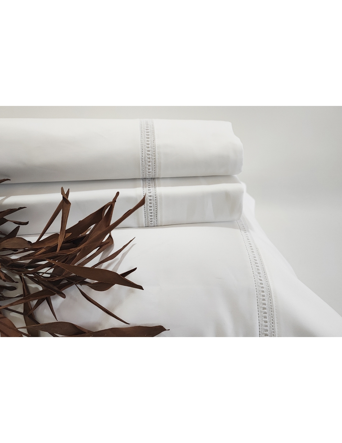 Sábanas de 100% algodón peinado y raso mercerizado de 1000 hilos, con una tira bordada aplicada sobre una solapa de 11cm que le aporta ligereza y elegancia, sin perder la sencillez.