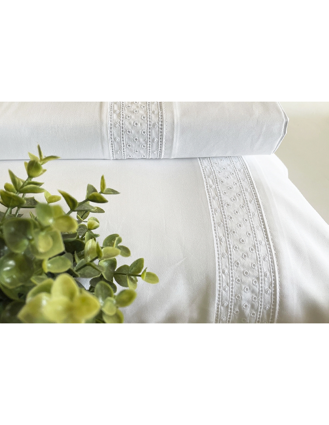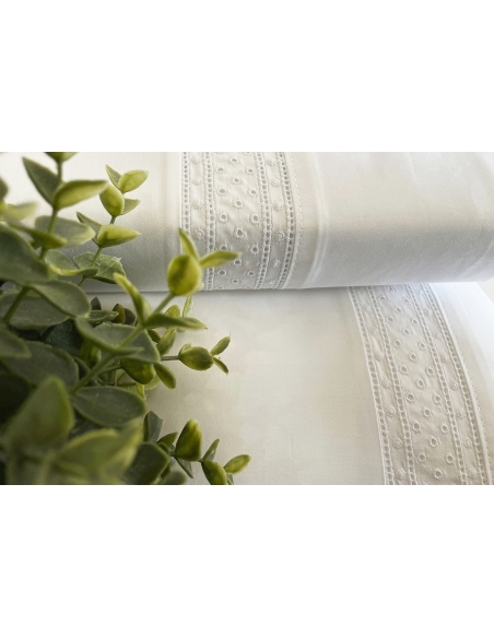 Sábana encimera y almohadas con aplicación de bordado. Las almohadas tienen aplicación por ambos lados y se cierran con una solapa.