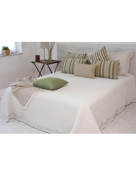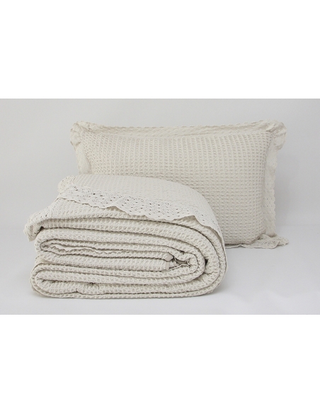 Edredón en tejido nido de abeja, con aplicación de puntilla, lavado con preencogimiento, lo que lo hace muy agradable, suave y confortable ya que no se mancha y por tanto no necesita plancha.