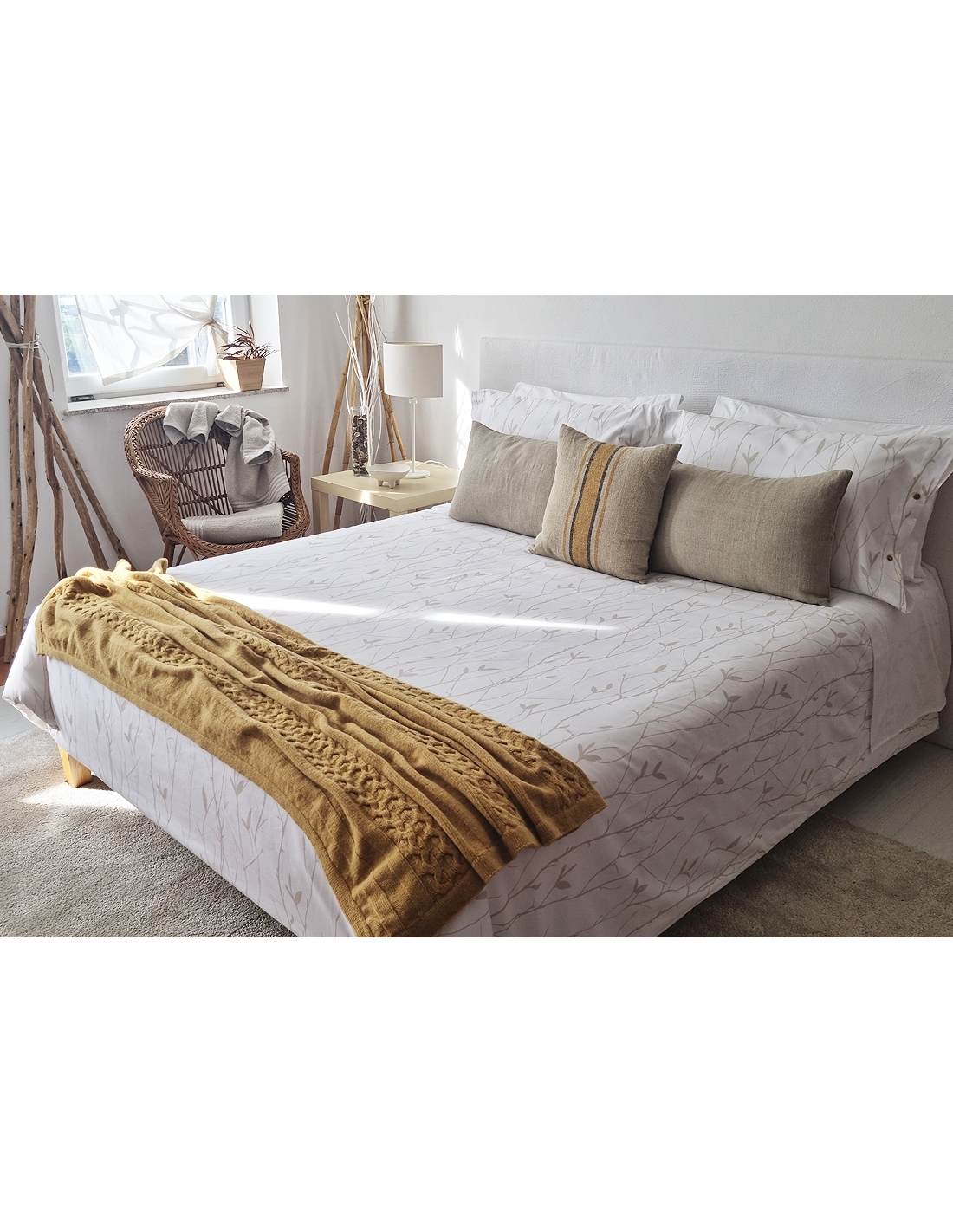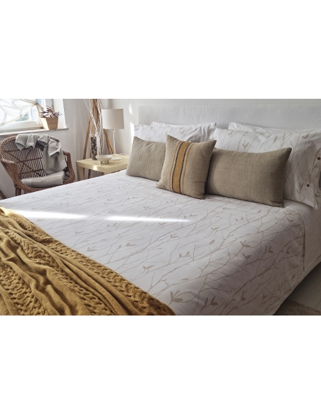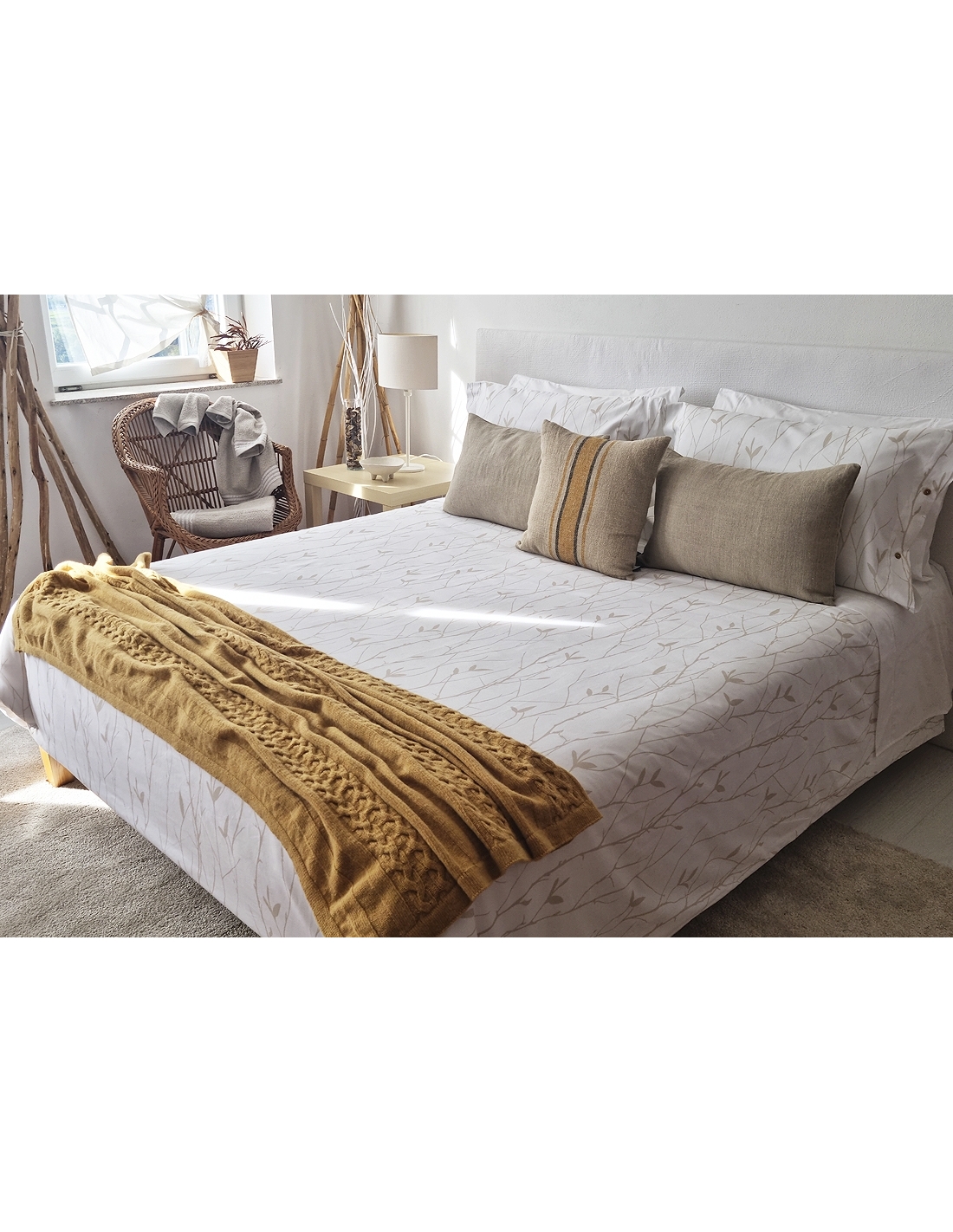 La funda se cierra con una solapa de 0,45 cm en la parte inferior para colocar debajo del colchón o hacer un sobre, evitando que se resbale. Los cojines se cierran con botones a ambos lados.