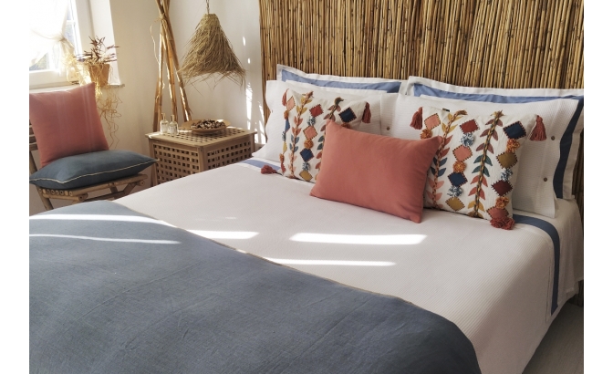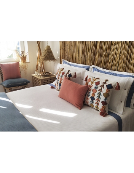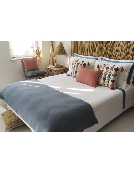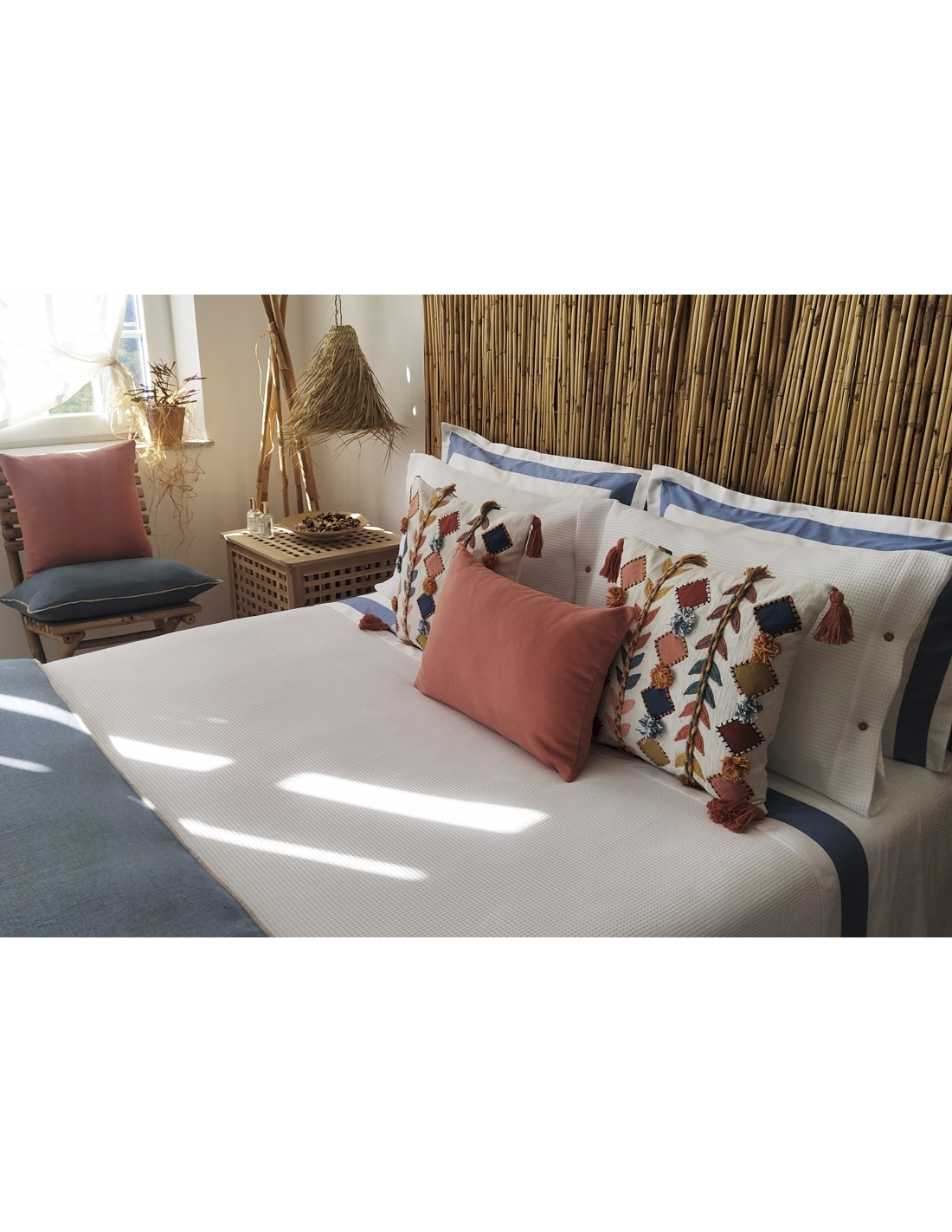 La funda se cierra con una solapa de 0,45 cm en la parte inferior para colocar debajo del colchón o hacer un sobre, evitando que se resbale. Y los cojines se cierran con botones a ambos lados.