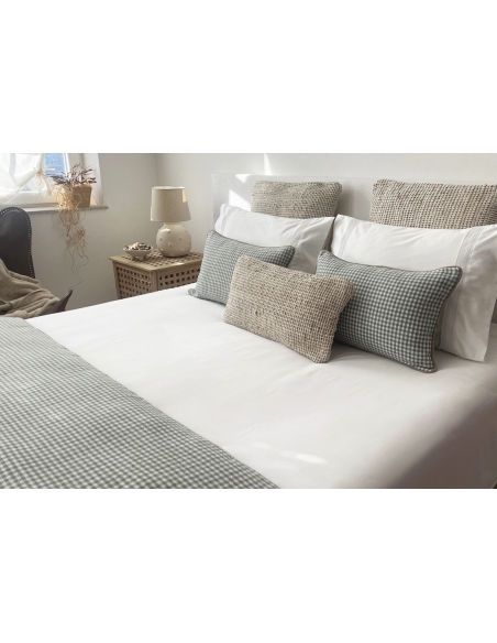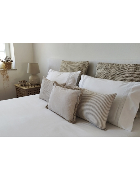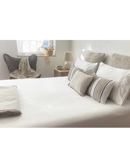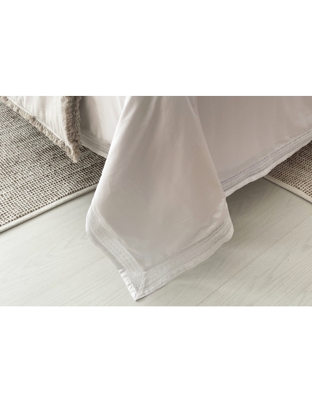 Funda nórdica lisa em algodon de 500 hilos y con aplicación de bordado alrededor. Los cojines son lisos con bordados a ambos lados y se cierran con una solapa.