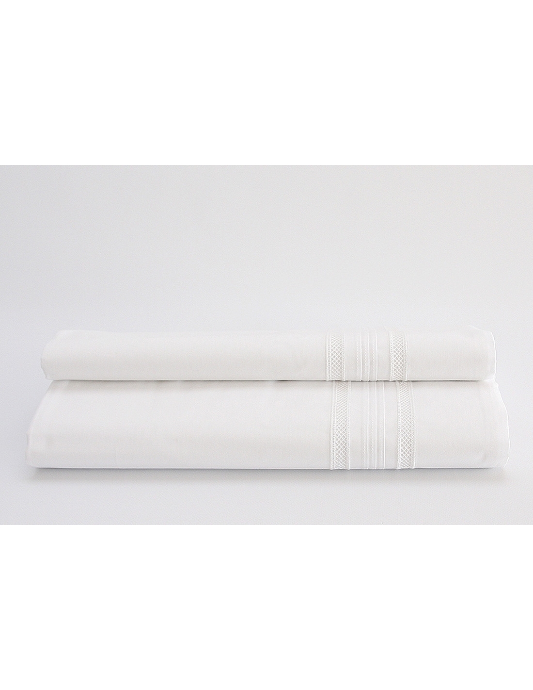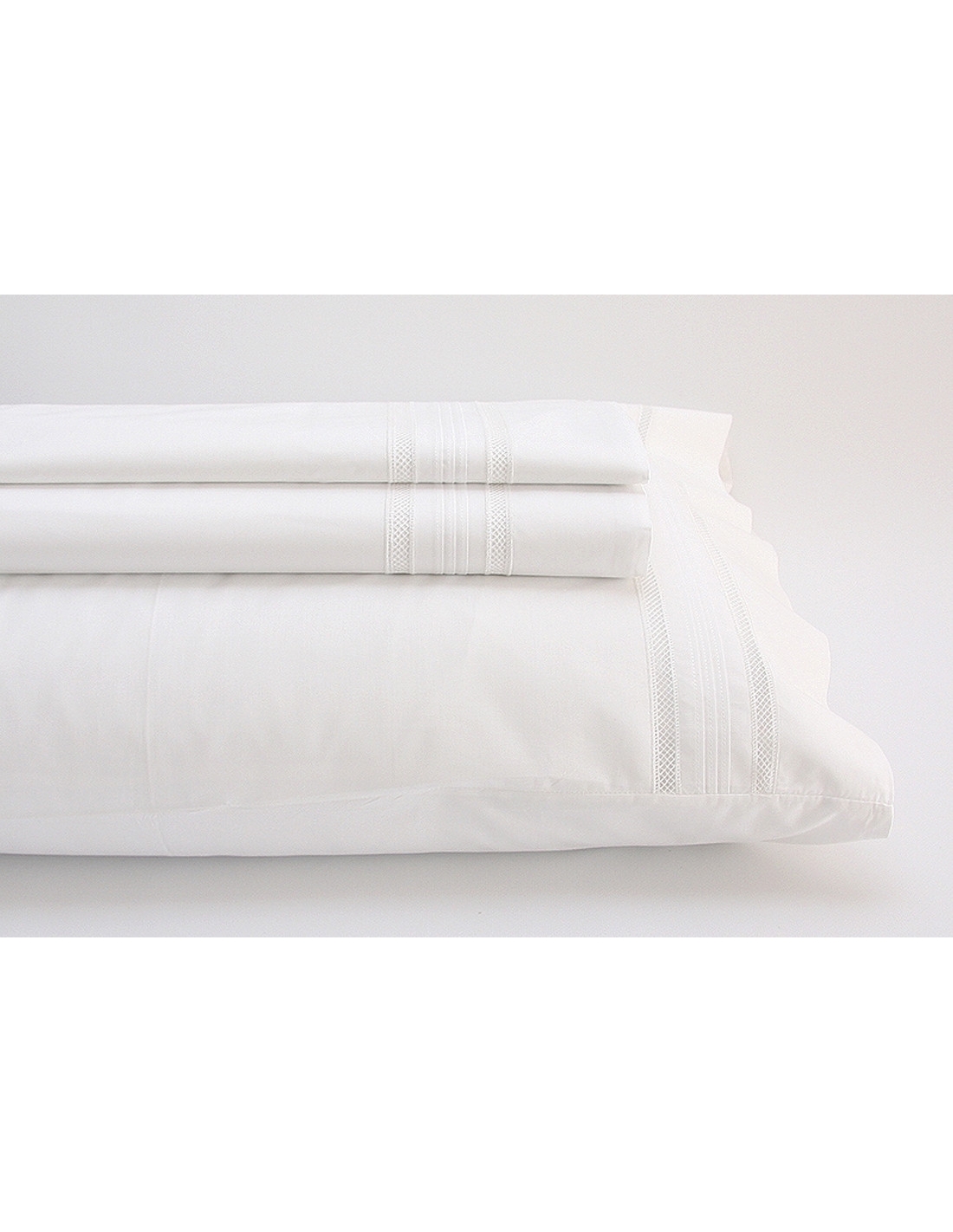 Sábana encimera con almohadas con nervaduras e inserciones. Sabana con acabado de esquina y las almohadas tienen aplicacion a ambos lados y se cierran con dos solapas.