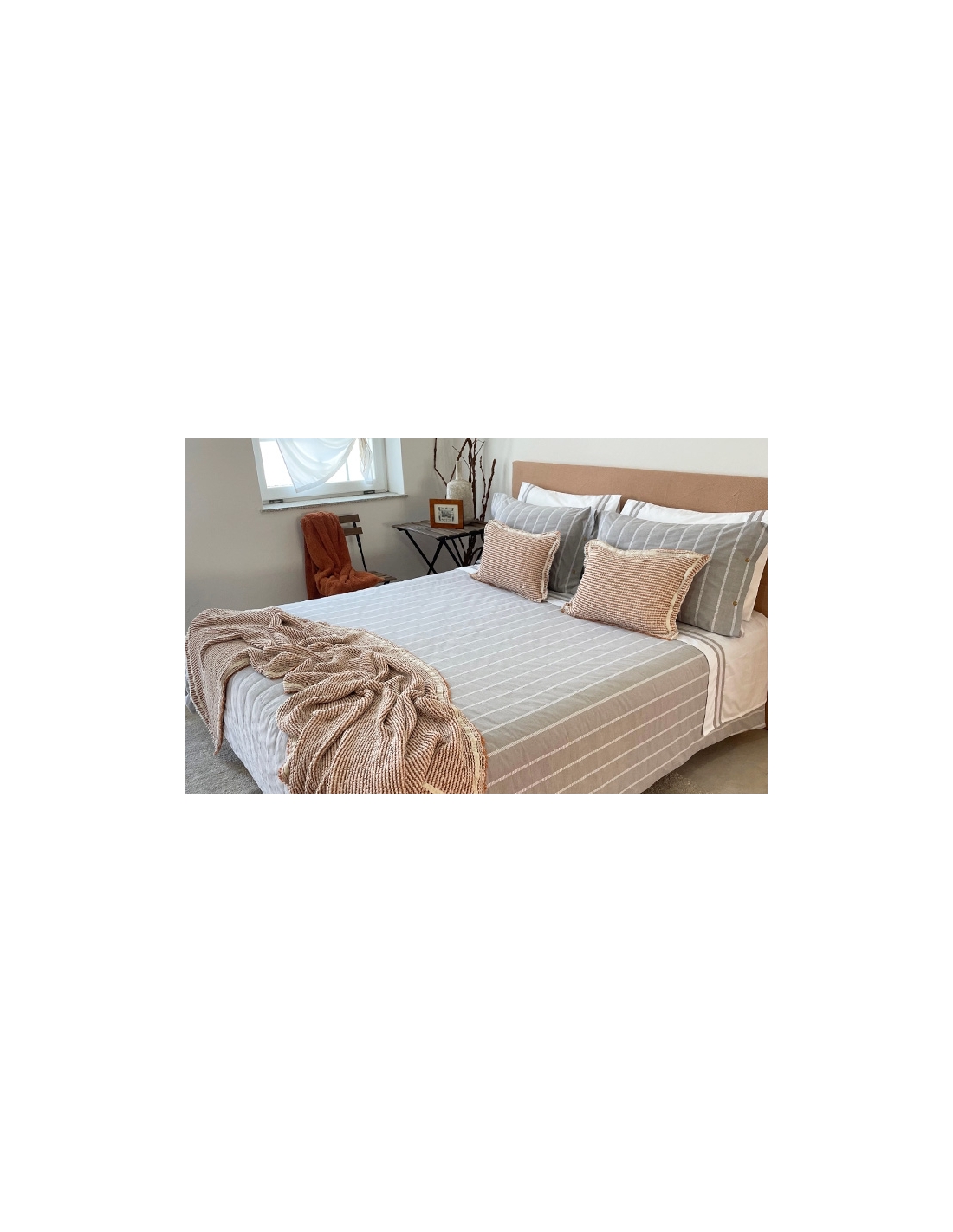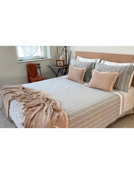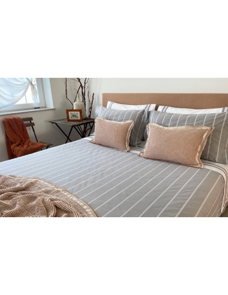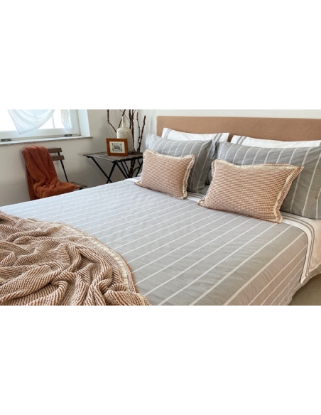 La funda se cierra con una solapa de 0,45 cm en la parte inferior para colocar debajo del colchón o hacer un sobre, evitando que se resbale. Y los cojines se cierran con botones a ambos lados.