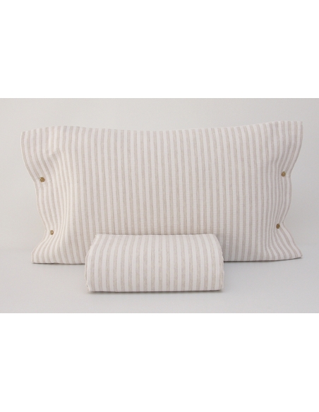 La funda se cierra con una solapa de 0,45 cm en la parte inferior para colocar debajo del colchón o hacer un sobre, evitando que se resbale. Y los cojines se cierran con botones a ambos lados.