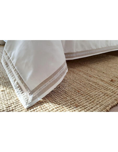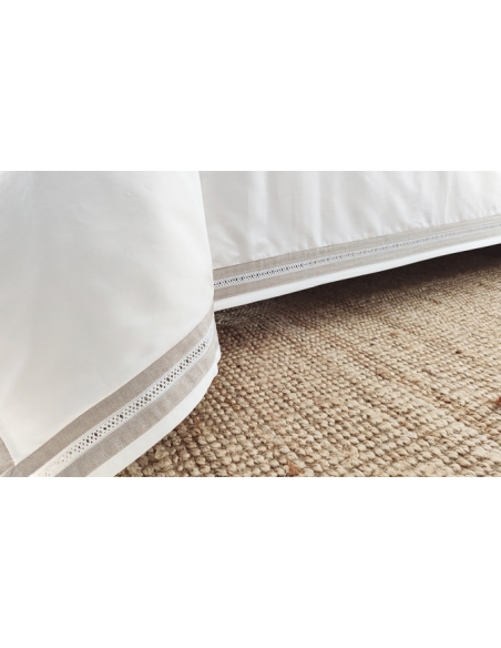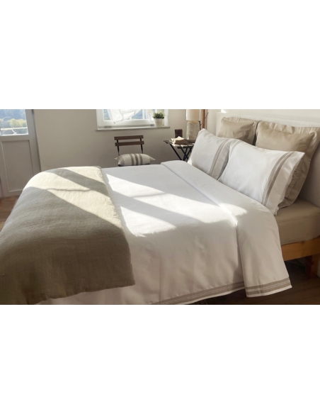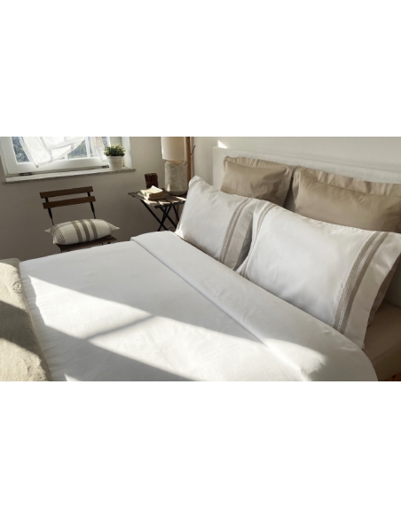 Saco nórdico de algodón satinado de 500 hilos con aplicación de bordado en todo el contorno. Los cojines son lisos con bordados por ambas caras y se cierran con solapa.