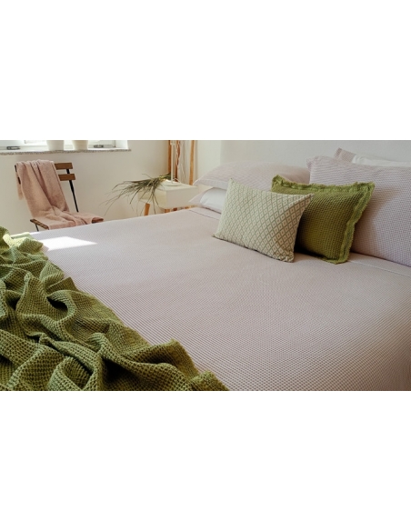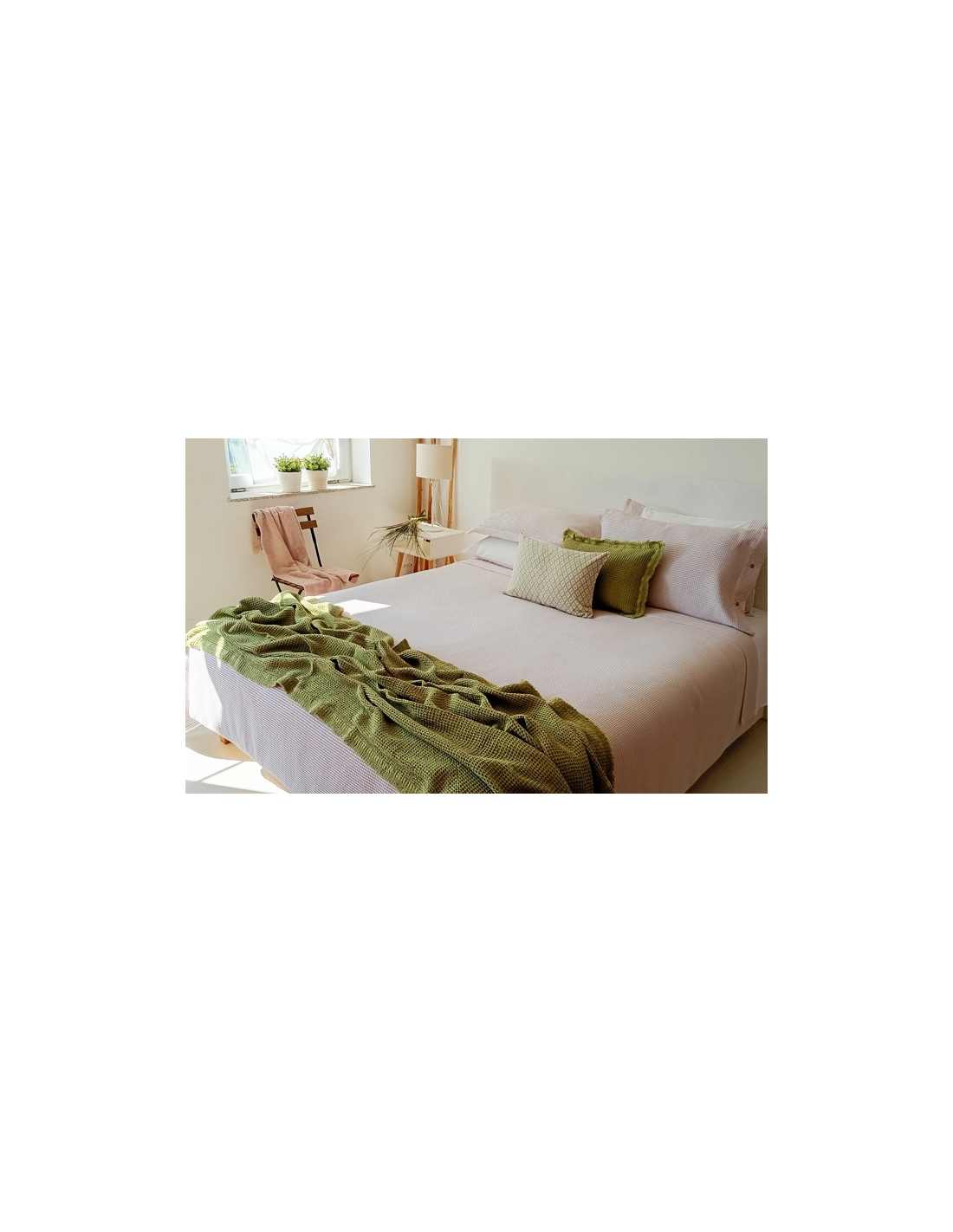 La funda se cierra con una solapa de 0,45 cm en la parte inferior para colocar debajo del colchón o hacer un sobre, evitando que se resbale. Y los cojines se cierran con botones a ambos lados.