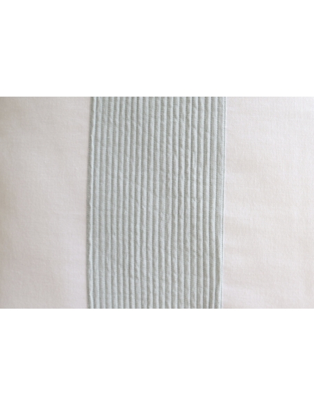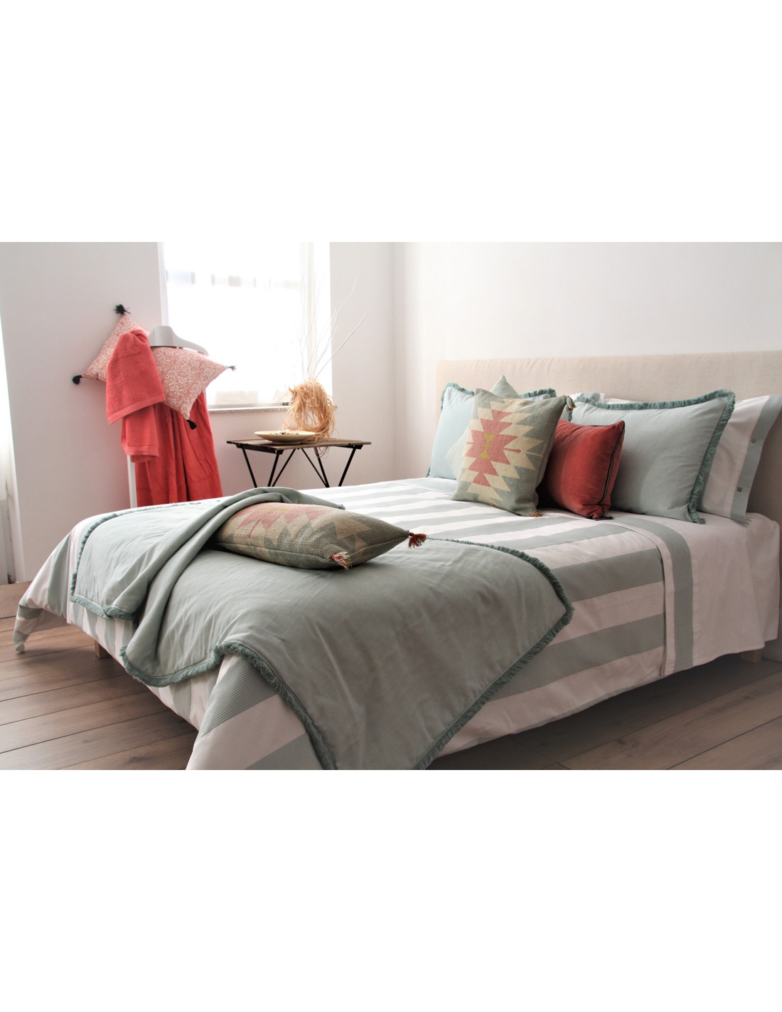 La funda se cierra con una solapa de 0,45 cm en la parte inferior para colocar debajo del colchón o hacer un sobre, evitando que se resbale. Y los cojines se cierran con botones a ambos lados.