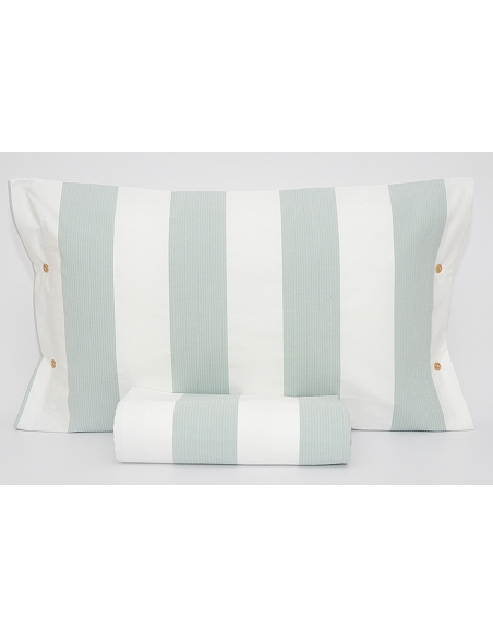 Funda nórdica con diseño de rayas y dorso liso en color blanco, así como las respectivas almohadas. Permite dormir sobre el lado liso y decorar con el lado impreso.