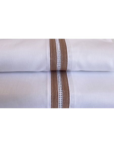 Sábana encimera y almohadas con aplicación de tejido y bordado. Las almohadas tienen aplicación por ambos lados y se cierran con una solapa.