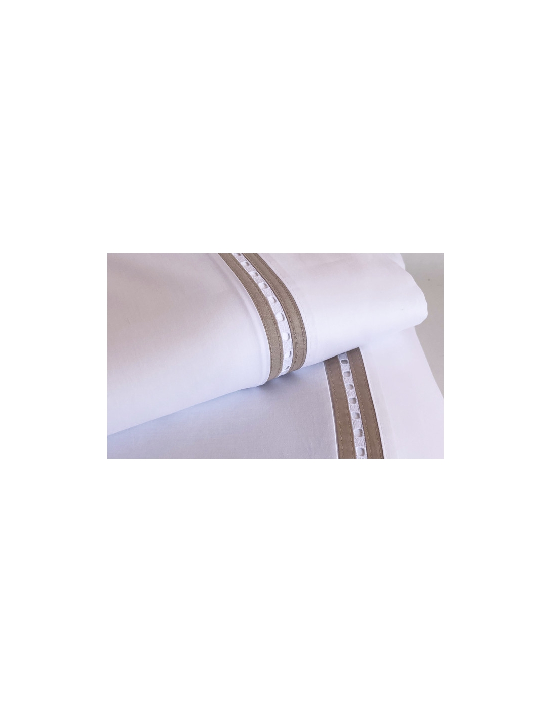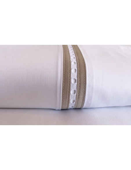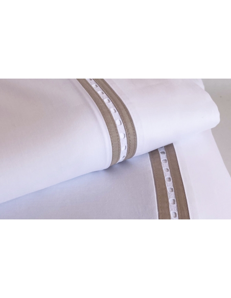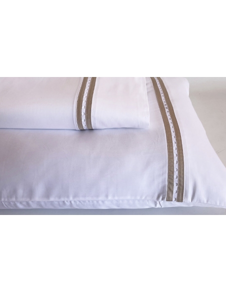Sábana encimera y almohadas con aplicación de bordado. Las almohadas tienen aplicación por ambos lados y se cierran con una solapa.