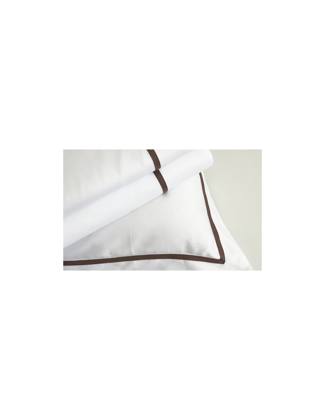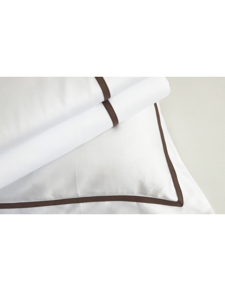 Sábana encimera y almohadas con aplicaciones de barra de color en el mismo tejido. Las almohadas se aplican en tres lados y se cierran con una solapa.