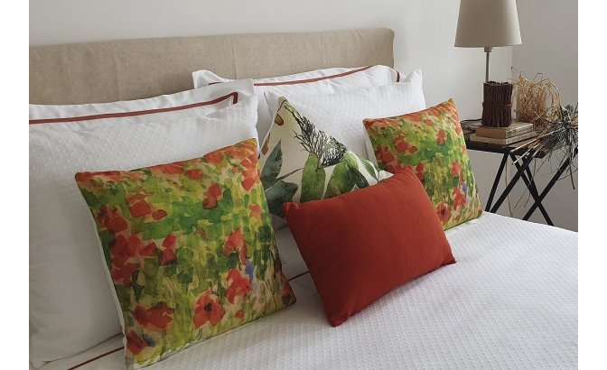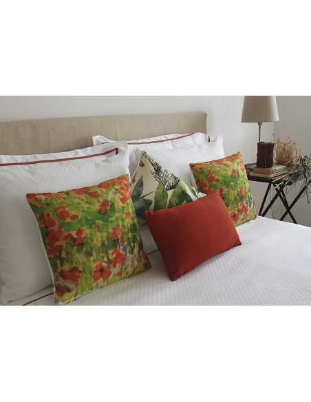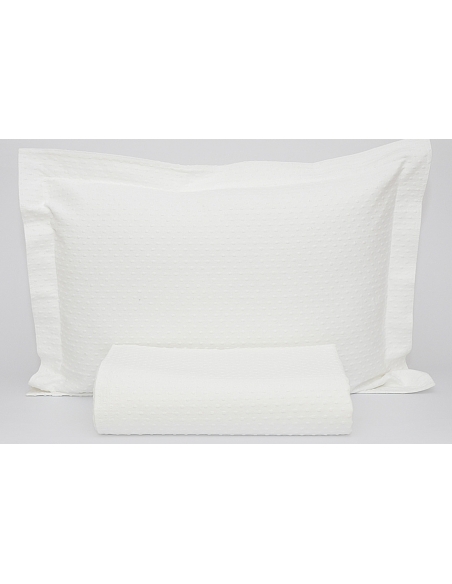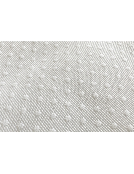 Colcha de algodón con textura de piqué y lunares en relieve. Terminando con esquinas cortadas y haciendo cuatro agujas.