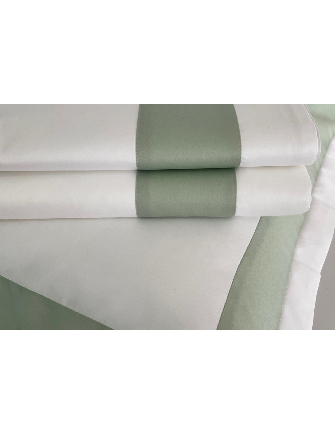 Sábana encimera y almohadas con aplicaciones de barra de color en el mismo tejido. Las almohadas se aplican en tres lados y se cierran con una solapa.