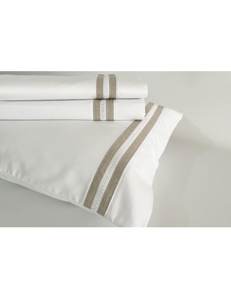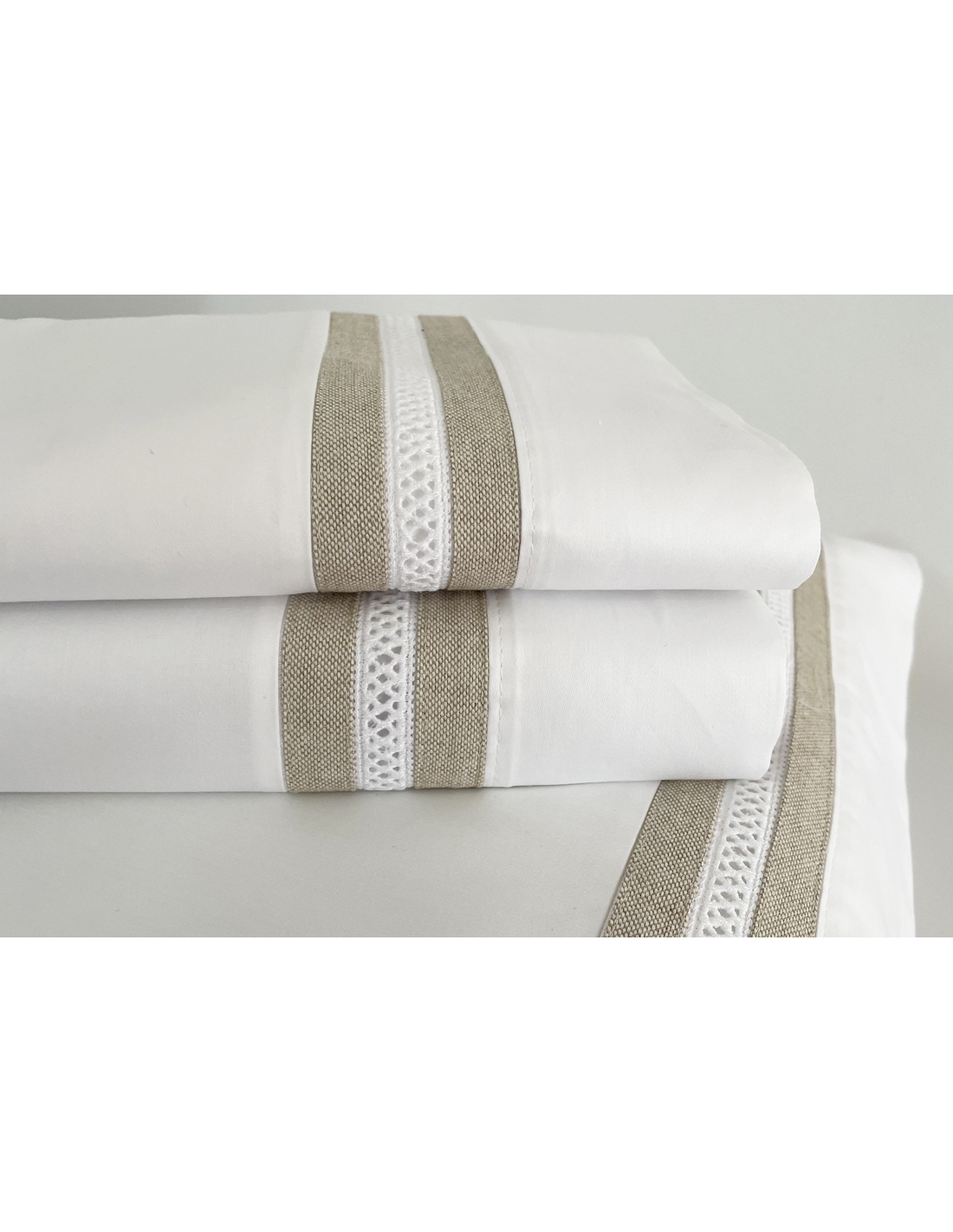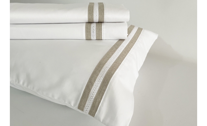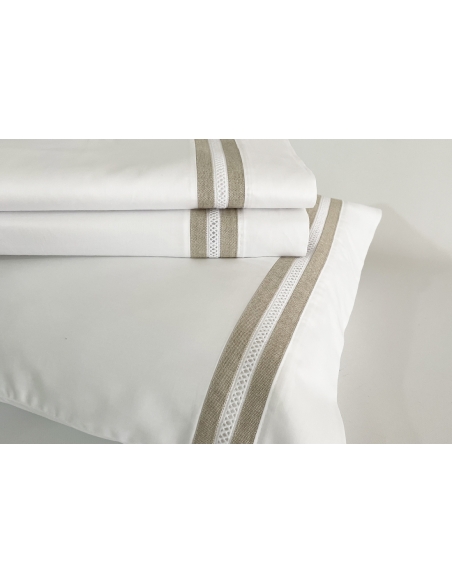 Sábana encimera y almohadas con aplicación de tejido y bordado. Las almohadas tienen aplicación por ambos lados y se cierran con una solapa.