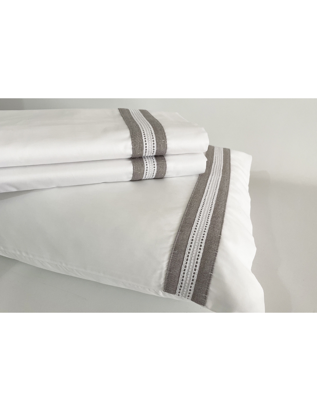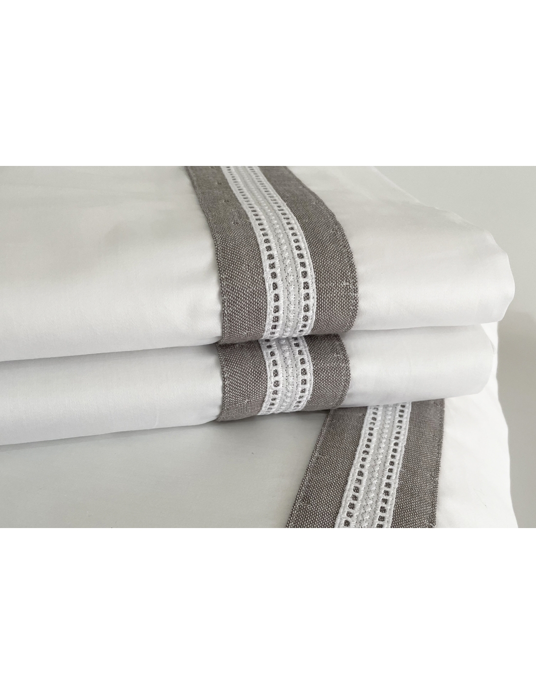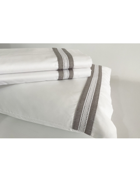 Sábana encimera y almohadas con aplicación de tejido y bordado. Las almohadas tienen aplicación por ambos lados y se cierran con una solapa.